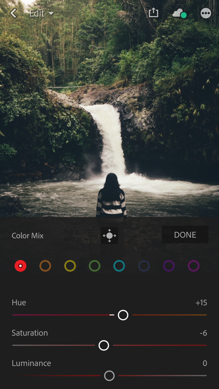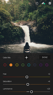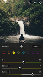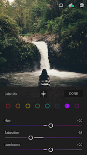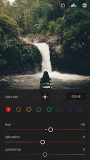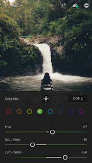 Sesuaikan temperature dan tint-nya. Jika fotomu terlalu sedikit kuning maka turunkan temperature-nya. Begitupun sebaliknya jika fotomu terlalu biru. Oh ya, salah satu ciri foto Folk adalah foto yang tampak desaturated, maka kurangi saturasinya sedikit agar tampak lebih soft warnanya. Jika sudah diatur sesuai foto, lanjut ke MIX yang masih satu tempat dengan COLOR.