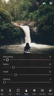 Selanjutnya aturlah tingkat ketajaman fotomu di menu Detail, tambahkan sharpening sedikit. Jangan terlalu banyak ya, karena sesuatu yang terlampau berlebihan itu tidak bagus.