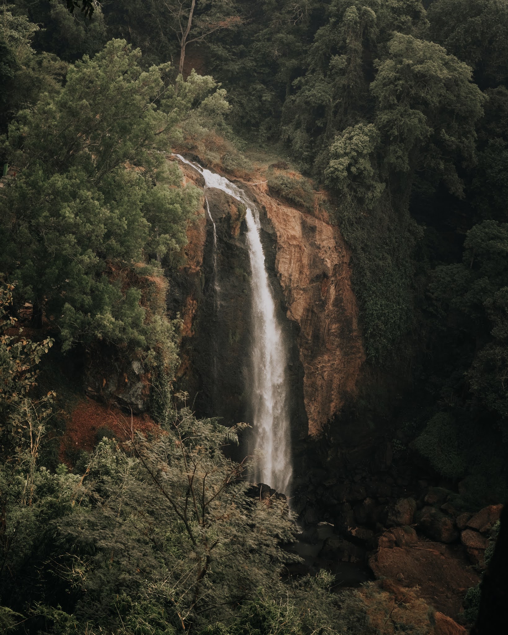 Seperti biasa, jalan menuju air terjun merupakan jalanan menurun dengan anak tangga yang sudah sangat rapi. Sepertinya memang kalau ke air terjun itu harus menurun dulu ya, ada enggak sih yang jalannya malah naik dulu? Sekitar 10 menit, saya sampai di view point terbaik di sini, tentu saja jaraknya dekat dari aliran air. Walaupun sebenarnya−kalau kita malas−bisa saja hanya nonton air terjun ini dari ketinggian, karena memang disediakan gardu pandang di sana. Tapi, untuk saya pribadi sayang sekali jika hanya menikmatinya dari jauh saja.