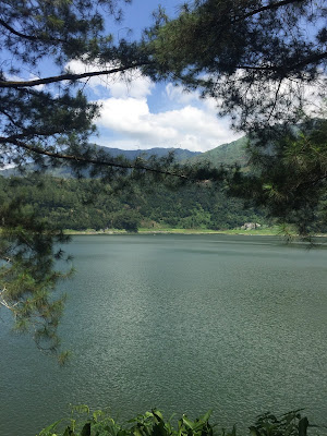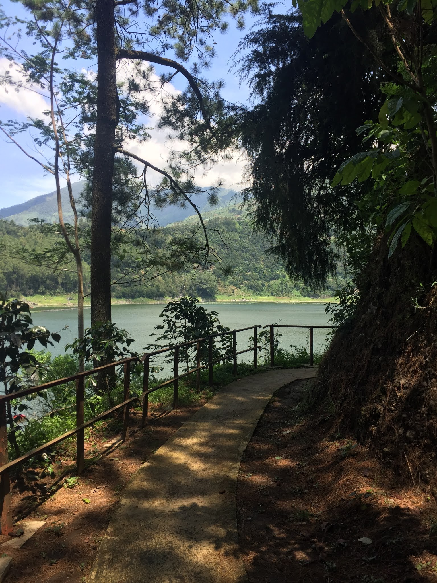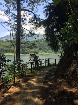 Akhirnya saya memutuskan untuk mencari spot sendiri yang lebih baik dan natural. Saya iseng melewati jembatan di sebelah pos tiket dan mencari jalan menuju satu tempat yang terlihat hijau dengan batu-batu. Dan nemu juga akhirnya, ternyata memang ada jalannya hanya saja tidak ada petunjuk arah. Kalau orang yang enggak sengaja muter-muter mungkin bakal enggak nemu jalannya. Pokoknya tinggal cari jalan dengan pembatas berwarna merah, dan ikuti saja sampai bisa dekat dengan pinggir danau.